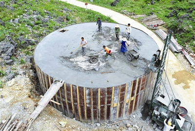 日前,在大化瑶族自治县板升乡弄勇村毛星屯,施工队正在施工。这是政府为村民修建的一个300立方米的大水柜。今年,在弄勇村,政府正在为村民修建5座300立方米的大水柜。建成后,弄勇村将有11个屯建设有200立方米以上的大水柜。“十二五”期间,大化县大力推进瑶山饮水安全工程建设,截至2014年,已建设2462座水柜,今年全县农村家庭水柜建设将增至3087座,建成后将减轻瑶山百姓“背水”饮用的压力。 (黄孝邦)