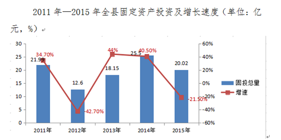 2015年,全县全社会固定资产投资完成316979万元,同比增长8.4%,500万元以上固定资产投资200151万元,比去年同期下降21.5%,其中:基本建设投资53768元,同比增长6.8%;更新改造投资44816万元,同比下降45.1%;其他投资1432万元,同比持平;房地产开发8432元,比去年同期下降20.6%。全年新增固定资产149913万元,同比增长8.8%。全年房屋施工面积486521平方米,同比下降1.4%。
