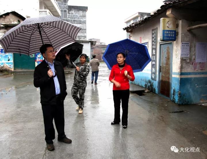 杨龙文(左)冒雨视察龙口村集镇环境。覃继虎 摄