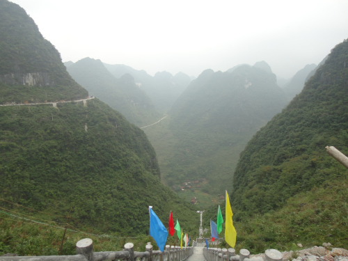 七百弄国家地质公园内被称为“天下第一弄”的甘房弄,由西、北、东、南4个主峰、7个次峰和4个主垭口组成,平面形态为不规则多边形,主峰海拔1021-1060米,东西向水平距离2600米,南北向距离2310米,洼地四周为陡坡,坡度大于70度,局部为绝壁,口大底小,深530米,容积18840万立方米;受次级节理裂隙影响,弄口还分出8个方向不同的槽形谷地,是世界岩溶区最深最大的洼地;弄底中心点海拔530米,平面形态近圆形,底平缓,微向东南方倾斜,其上分布多处落水洞,暴雨时有水涌出,常年不涝不旱。沿着蛇行于乱石灌木丛中的1418级台阶走到洼底,布努瑶人当把你看作“天外来客”。
