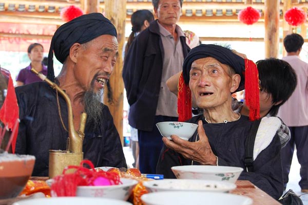 大化布努瑶群众逢年节喜庆都有“吃笑酒”的习俗。酒过三巡,酒兴正浓时,往往会有人或以趣闻轶事为由,或说笑话,讲故事,或吟咏类似相声的“笑酒词”。大家边听边笑,边笑边唱,边唱边喝,歌词诙谐,妙趣横生,场面极为热闹。“笑酒”拖的时间长,或从早到晚,或一夜到天亮,最短也是五六个钟头。