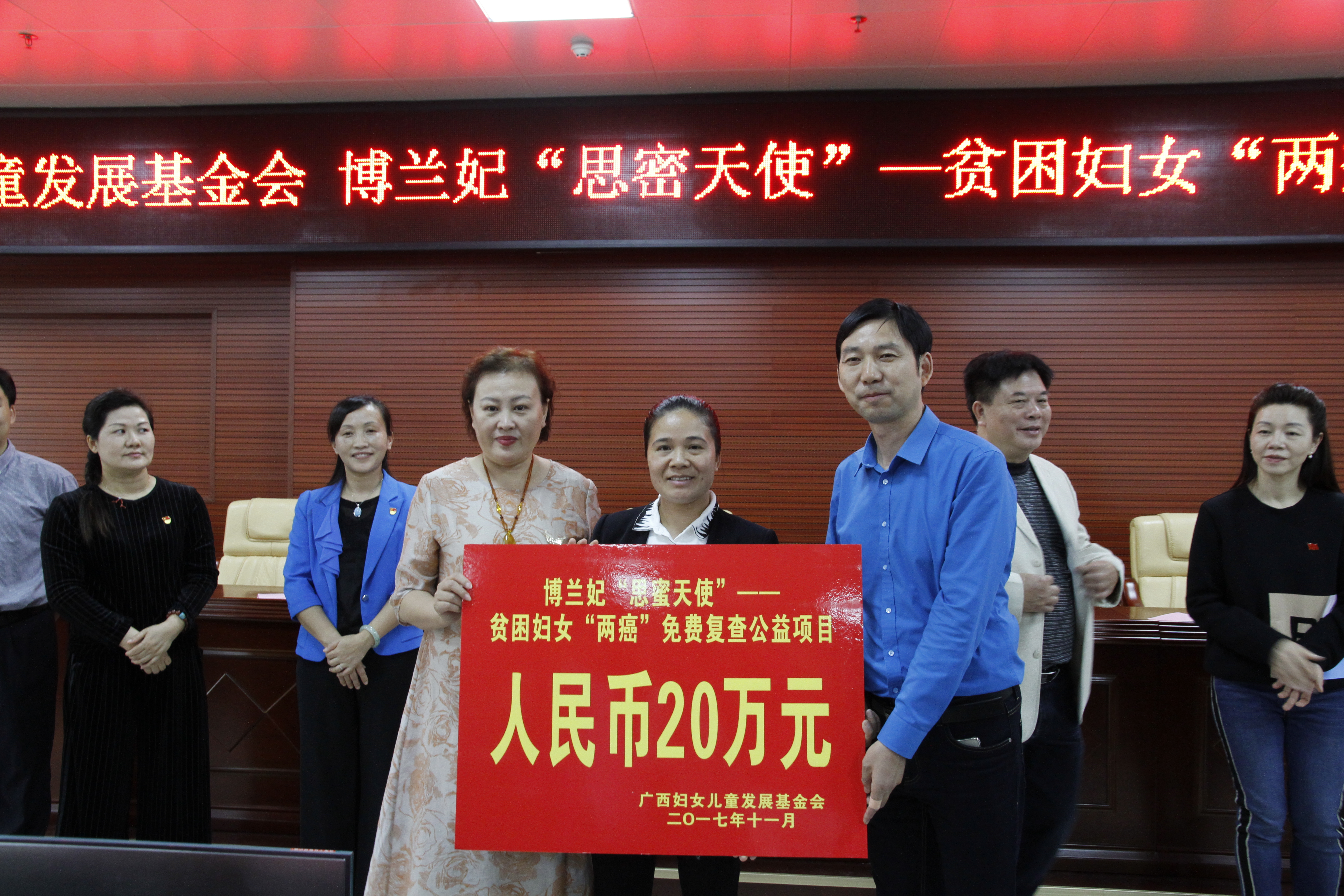 (五)做好“两癌”筛查,牵手“健康脱贫”。2017年,组织开展妇女“两癌”检查活动,共为3000多名妇女免费检查,并为14名贫困患病妇女争取到救助金14万元;今年11月,争取到广西妇女基金会、博兰妃“思蜜天使”贫困妇女“两癌”免费筛查项目资金20万元,同时,慰问贫困妇女“两癌”患者3名,发放慰问金每人1万元。