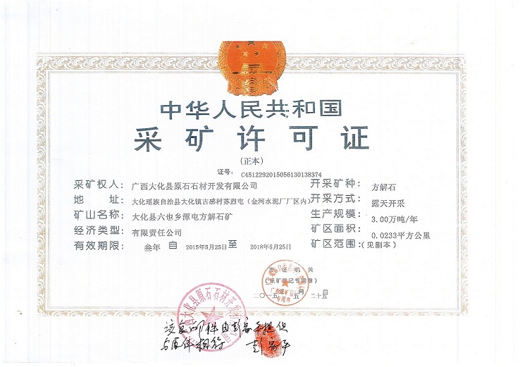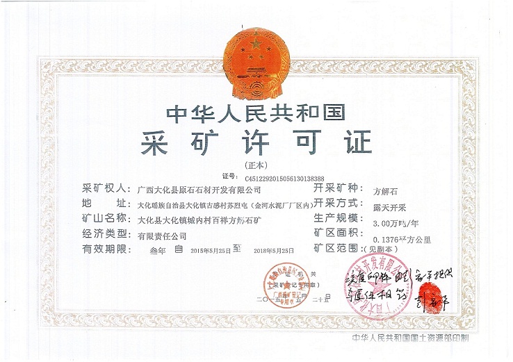 附件:大化县六也乡潭屯方解石矿开采许可证、大化县大化镇城内村百祥方解石矿