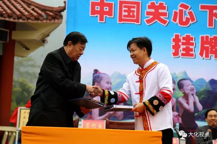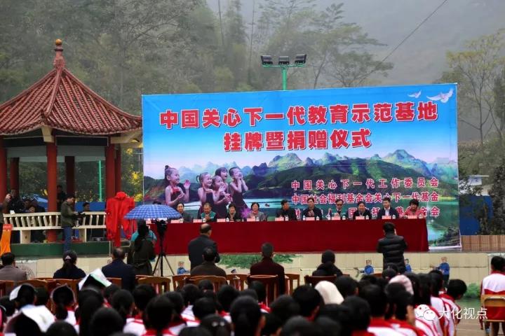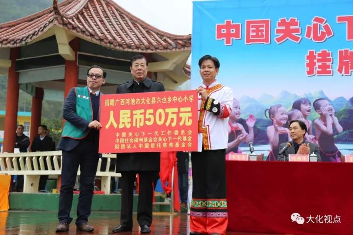 12月12日,由中国关心下一代工作委员会、中国社会福利基金会关心下一代基金和中国信托慈善基金会共同实施的“中国关心下一代教育示范基地”项目,在大化瑶族自治县六也乡中心小学举行揭牌暨捐赠仪式活动。这是河池市首个中国关心下一代教育示范基地。