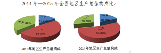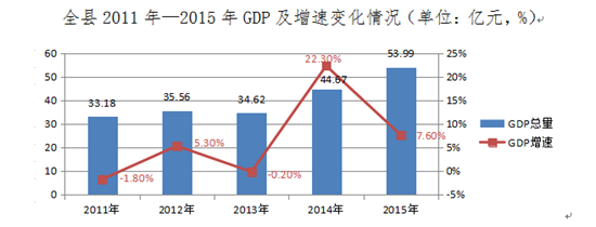 2015年,全县实现地区生产总值(GDP)53.99亿元,增长7.6%。其中,第一产业实现8.76亿元,增长2.9%,对经济增长的贡献率为6.1%,拉动经济增长0.47个百分点;第二产业实现25.8亿元,增长9.9%,对经济增长的贡献率为73.5%,拉动经济增长5.6个百分点;第三产业实现19.43亿元,增长5.8%;对经济增长的贡献率为20.4%,拉动经济增长5.6个百分点。三次产业结构比由2014年的18.4:53.3:28.3改善为16.2:47.8:36。 2015年全县人均国内生产总值(GDP)14591元(现价),增长20%。