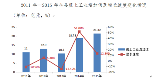 2015年,全县经济继续保持快速增长势头,社会各项事业全面进步,各项经济指标增速在全市排位比较靠前。其中,地区生产总值增速全市排第3位;全部工业增加值增速排第3位;农林牧渔业总产值增速排第5位;规模以上工业增加值排第3位;全部工业总产值增速排第3位;规模以上工业总产值排第4位;社会消费品零售总额增速排第4位;农村居民人均可支配收入增速排第4位;城镇居民可支配收入增速排2位;财政收入增速排第3位。