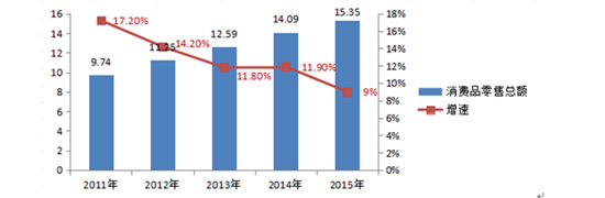 2011年—2015年消费品零售总额及增长速度(单位:亿元,%)