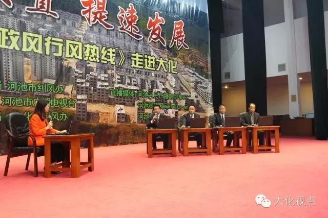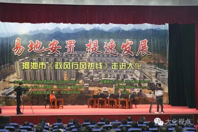 11月3日下午,河池市2016年“政风行风热线”走进大化瑶族自治县,开展主题为“易地安置•提速发展”的直播活动。河池人民广播电台FM987、河池视频网、河池手机网现场直播。县委副书记、县长韦萧强,县委常委、常务副县长黄碧海以及县扶贫办主任、县发改局局长共4人作为上线嘉宾走进直播间,现场听取民意,为群众答疑解惑。