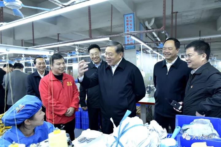 张秀隆(右三)在大化县易地扶贫搬迁与城镇化建设试点工程巴怀安置点农民工创业园参观。韦哲 摄