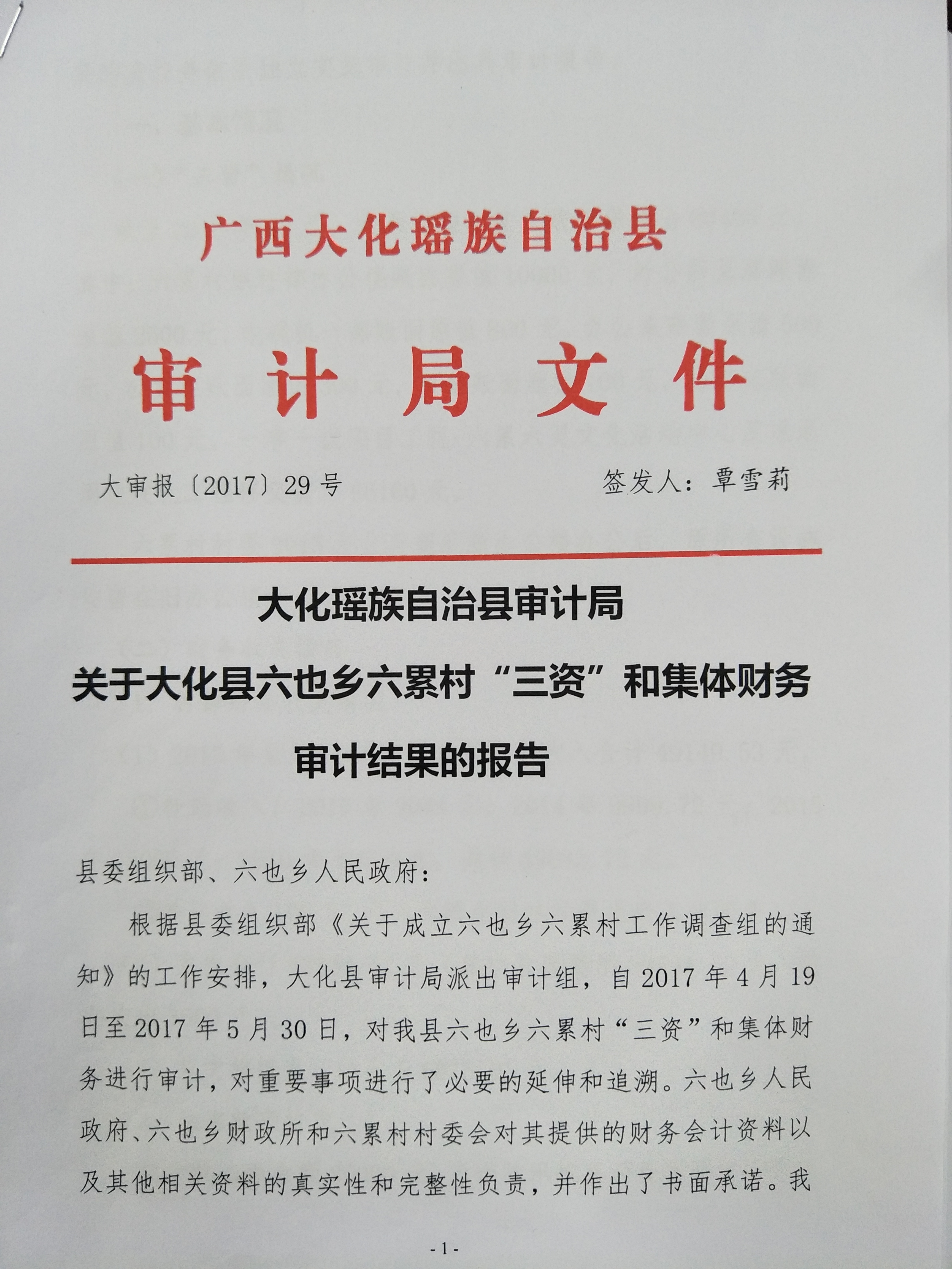 关于大化县六也乡六累村“三资”和集体财务审计结果的报告