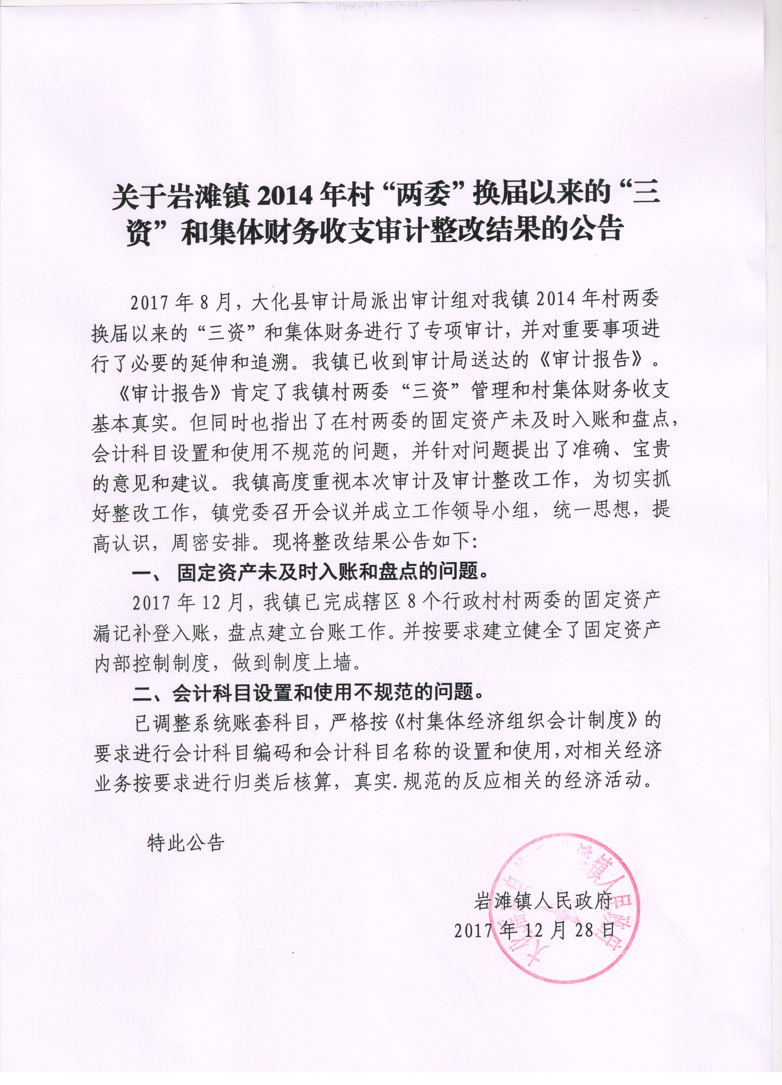 《审计报告》肯定了我镇村两委“三资”管理和村集体财务收支基本真实。但同时也指出了在村两委的固定资产未及时入账和盘点,会计科目设置和使用不规范的问题,并针对问题提出了准确、宝贵的意见和建议。我镇高度重视本次审计及审计整改工作,为切实抓好整改工作,镇党委召开会议并成立工作领导小组,统一思想,提高认识,周密安排。现将整改结果公告如下: