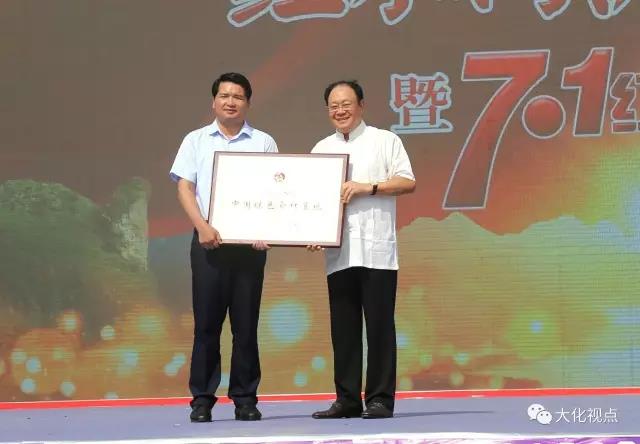 韦萧强(左)代表大化县人民政府接受中国饭店协会副会长屈启晓授予大化的“中国绿色食材基地”牌匾。黄 晗 摄