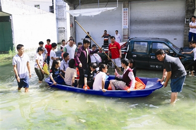 连日来,因受暴雨影响,大化瑶族自治县古文乡街上发生洪涝灾害,导致车辆和行人无法正常通行。该乡立即启动应急响应预案,将“主题党日”活动搬到了抗洪抢险一线,并安排8名干部,3艘划艇,轮流接送行人,帮助受灾群众尽快恢复生产生活和接送学生。上图为8月31日,党员干部用划艇接送学生上学。( 蓝瑞良 摄)